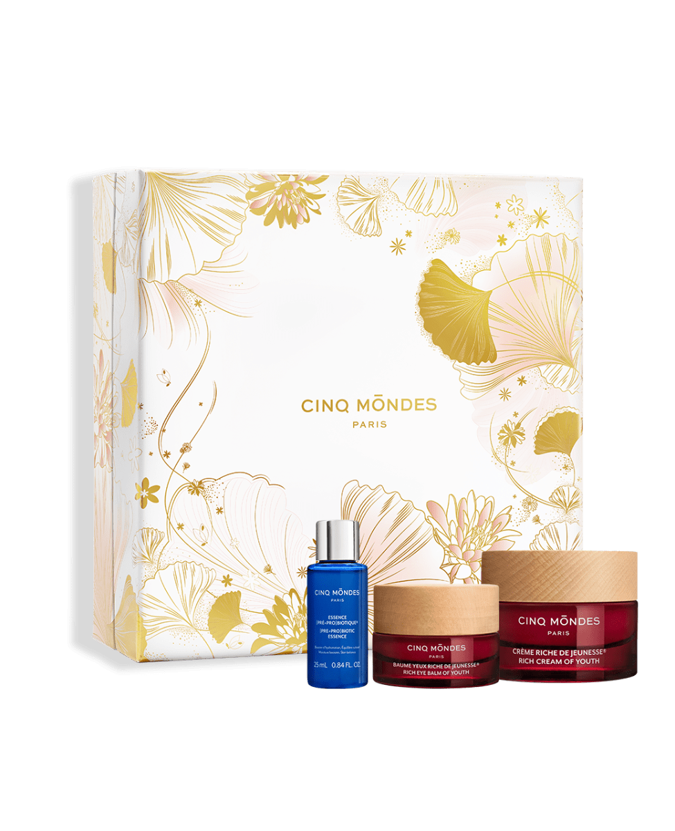 Ce coffret contient : une Essence [Pré+Pro]biotique 25ml, un Baume Yeux Riche de Jeunesse 15ml et une Crème Riche de Jeunesse 50ml.